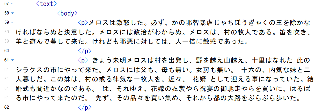 次に、本文 <body> でのマークアップをみてみよう。<front> を作成した場合には、それに続けて書くことになる、<front> がない場合には、<text> の直下にすぐに書くことになる。なお、TEI_BPTlibレベル3(*)の最低限のマークアップとしては、 <p> をつけて段落を明記することによる構造化だけでも十分である。その場合は、以下のようになる。